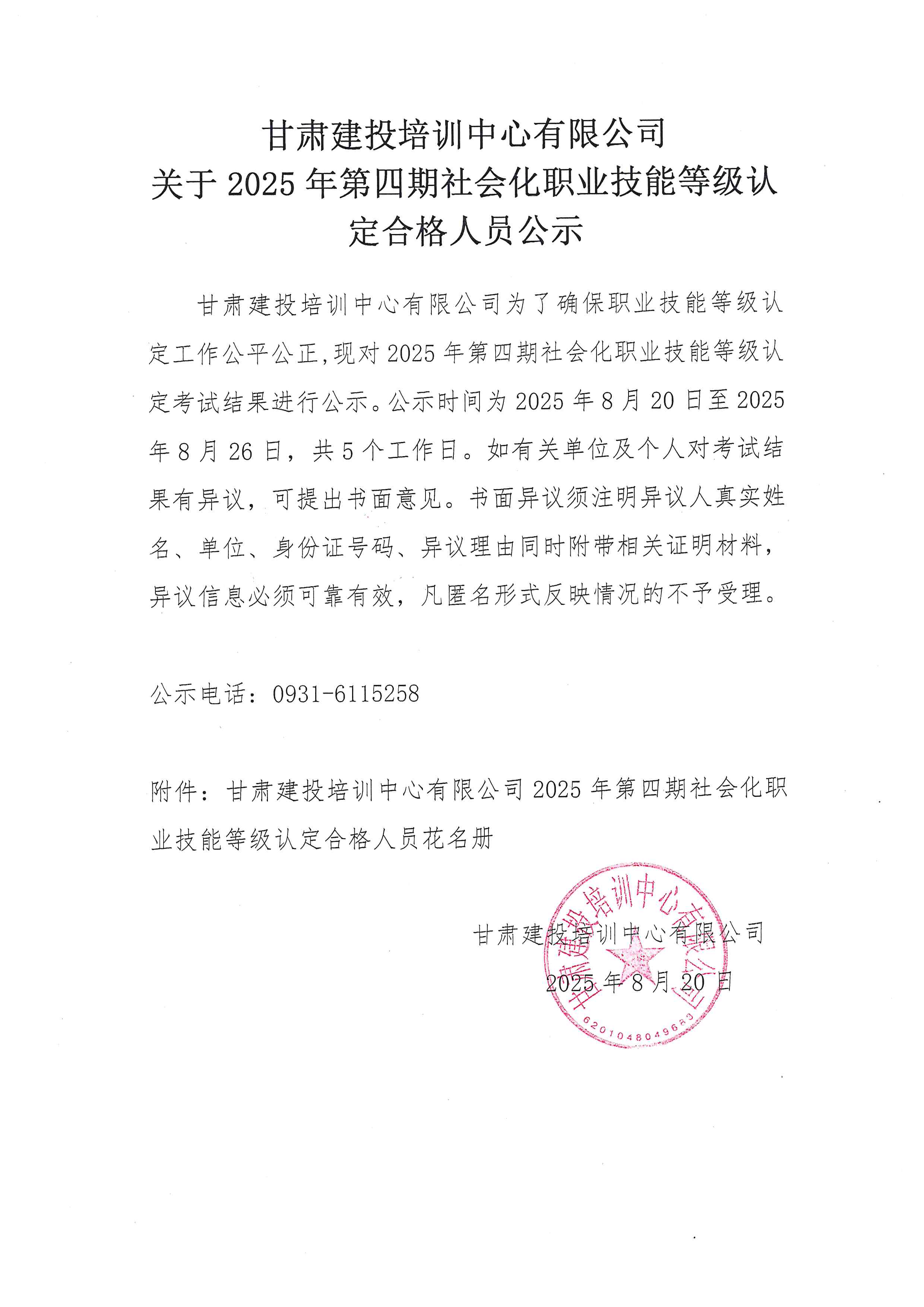 甘肅建投培訓(xùn)中心有限公司關(guān)于2025年第四期社會化職業(yè)技能等級認定合格人員公示