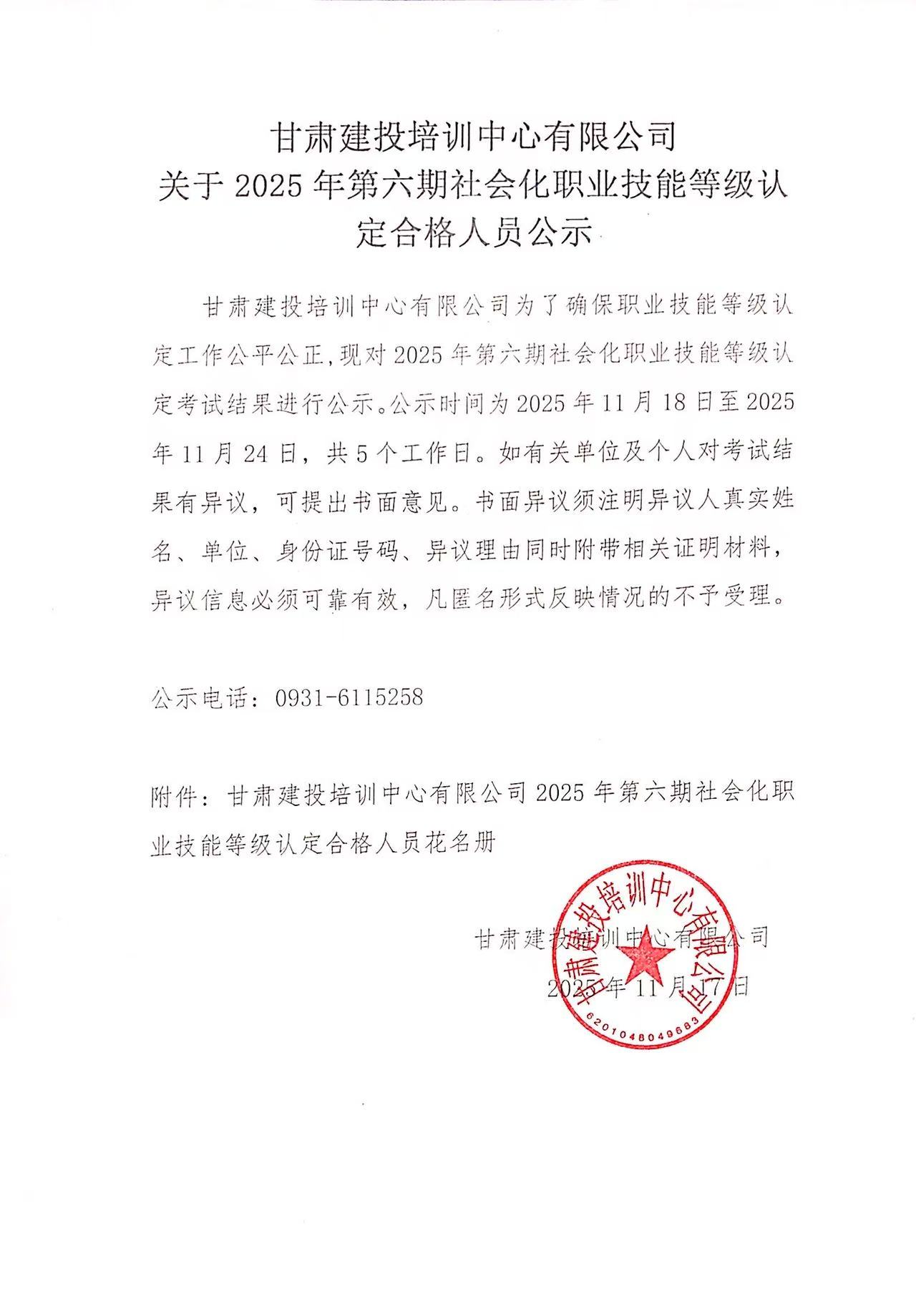 甘肅建投培訓(xùn)中心有限公司關(guān)于2025年第六期社會化職業(yè)技能等級認定合格人員公示